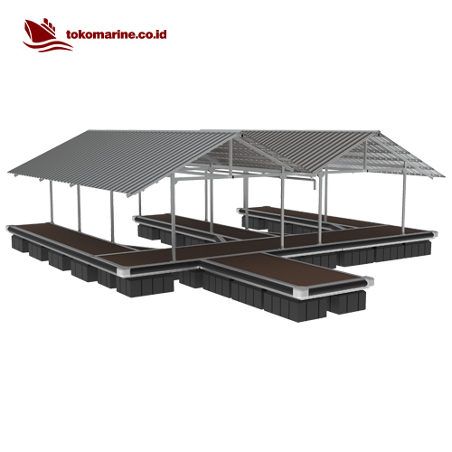 Garasi Boat Apung - Aluminium (Floating Boat Garage) adalah struktur terapung yang dirancang khusus untuk menyimpan, melindungi, dan mempermudah akses ke kapal atau perahu (biasanya speedboat, jetski, atau perahu kecil) di atas permukaan air. Struktur ini dibangun di atas modul pelampung plastic HDPE (High Density Polyethelene) yang di rangkai dengan aluminium marine dan WPC Decking dan dilengkapi dengan atap dan rangka baja ringan/galvanis/aluminium agar dapat menahan panas, hujan, dan sinar UV.